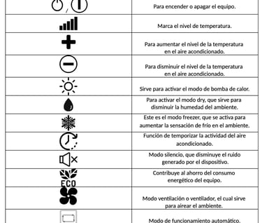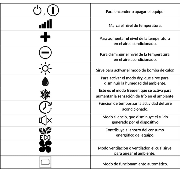 Imagina que estás tratando de enfriar tu habitación rápidamente, pero no sabes qué símbolo seleccionar en el control remoto. Sin un conocimiento claro de los símbolos de control, podrías terminar seleccionando el modo incorrecto y no obtener el resultado deseado.